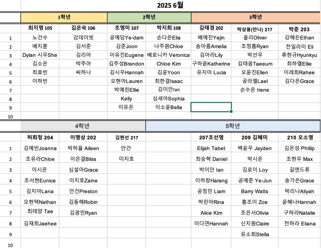 유초등부 섬기는 분과 소그룹 반 임현주 전도사님 최현수 부장님 김현선 간사님 2025년 새학기 반편성 1학년 최지영 선생님 1학년 김은숙 선생님 2학년 박지희 선생님 3헉년 김태경 선생님 3학년 박상용 선생님 3학년 박안나 선생님 3학년 박준 선생님 4학년 허희정 선생님 4학년 이명상 선생님 5학년 조선영 선생님 5학년 김혜미 선생님 5학년 오소영 선생님