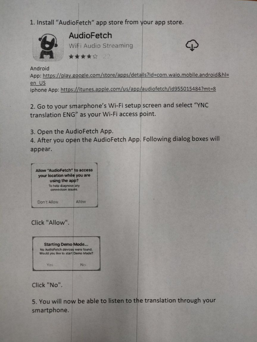 4. 연합 예배 중에 영어를 사용하는 사람들을 위한 통역이 핸드폰의 AudioFetch 라는 앱을 설치하여 개인의 전화기에서 들으실수 있습니다. 이를 위해 아이들은 이어폰을 꼭 챙겨와야 합니다. 자세한 내용을 첨부파일로 보내드립니다. 꼭 읽어보시고 준비해주세요.