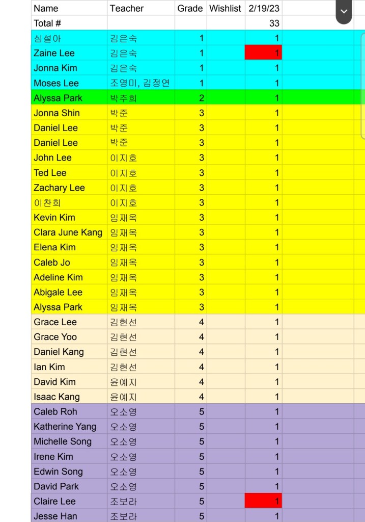 고학년에 Claire Lee 10 포인트를 받고 저학년에서 Zaine Lee 10 포인트를 받게 되었습니다. 그리고 선물을 미리 준비하기 위해서 미리 원하는 선물을 담임선생님께 얘기를 해 주시면 wishlist 에 기록해서 될수 있으면 미리 준비하도록 하겠습니다.