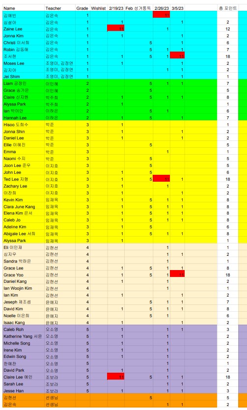 고학년에 Grace Yoo 10 포인트를 받고 저학년에서 Eunice Jo 10 포인트를 받게 되었습니다. 그리고 선물을 미리 준비하기 위해서 미리 원하는 선물을 담임선생님께 얘기를 해 주시면 wishlist 에 기록해서 될수 있으면 미리 준비하도록 하겠습니다.