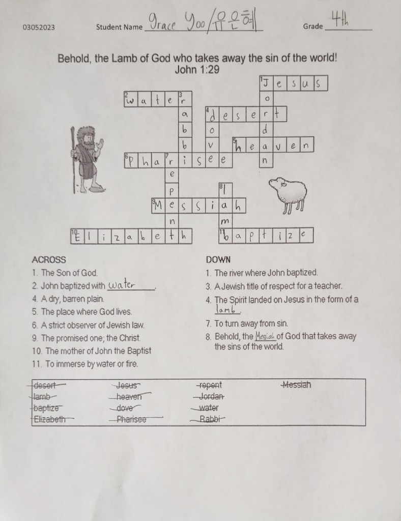 이번 주일에 매주 성경 퀴즈와 성경 통독 열심히 해서 제출이 되었습니다. 다음 주일엔 더 많은 참여 부탁드립니다. 이름을 적지 않고 제출한 아이들이 있습니다. 꼭 이름을 적어 제출하게 확인 부탁 드립니다.