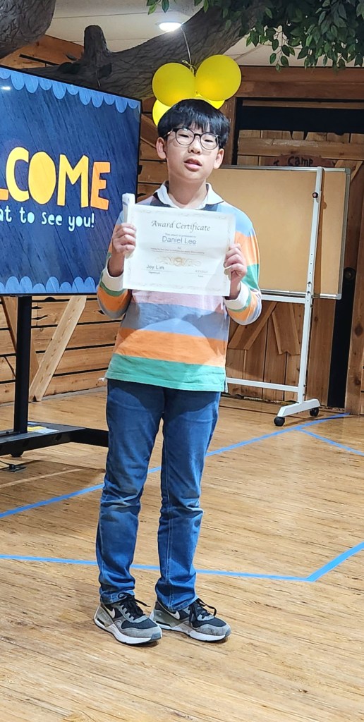 매주 성경퀴즈를 제출한 유년부 학생중에서 2명을 뽑아서 10포인트와 Award Certificate 을 드립니다. 더많은 유년부 아이들이 참여 하기를 바랍니다. 오늘은 모두 2명의 학생이 상을 받았습니다. 상받은 학생 Daniel Lee and Claire Shin 에게 수여했습니다. 축하합니다.