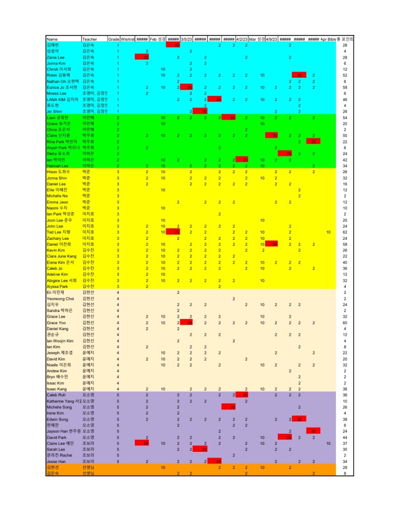 이번 주일도 매주 성경 퀴즈와 성경 통독 열심히 해서 제출이 되었습니다. 다음 주일엔 더 많은 참여 부탁드립니다. 이름을 적지 않고 제출한 아이들이 있습니다. 꼭 이름을 적어 제출하게 확인 부탁 드립니다. 아래 확인해 보시고 포인트 적립이 안된 경우 전도사님께 연락주세요.