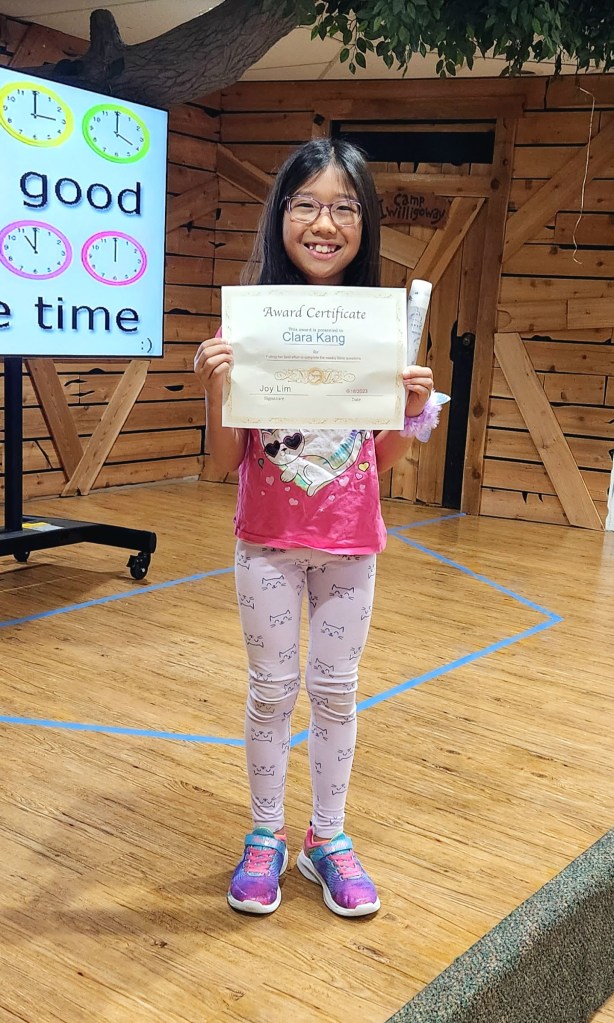 매주 성경퀴즈를 제출한 유년부 학생중에서 2명을 뽑아서 20포인트와 Award Certificate 을 드립니다. 더많은 유년부 아이들이 참여 하기를 바랍니다. 오늘 상받은 학생은 Clara Kang 입니다. Nathan Oh 는 결석으로 다음주일에 주도록 하겠습니다. 모두 축하합니다.