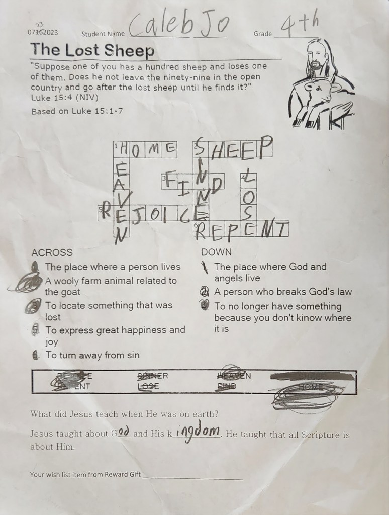 많은 학생들이 성경퀴즈를 해서 제출을 해 주었습니다. 부모님께서 적극적으로 아이들에게 격려해 주시길 부탁드립니다. 이름이 없거나 알아 볼수 없는 것은 앞으로 유년부 벽면에 걸어 놓아서 이름을 써서 다시 제출 하도록 하려 합니다.
