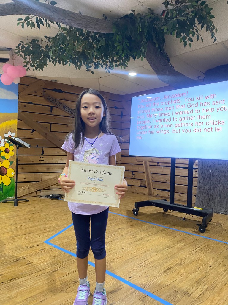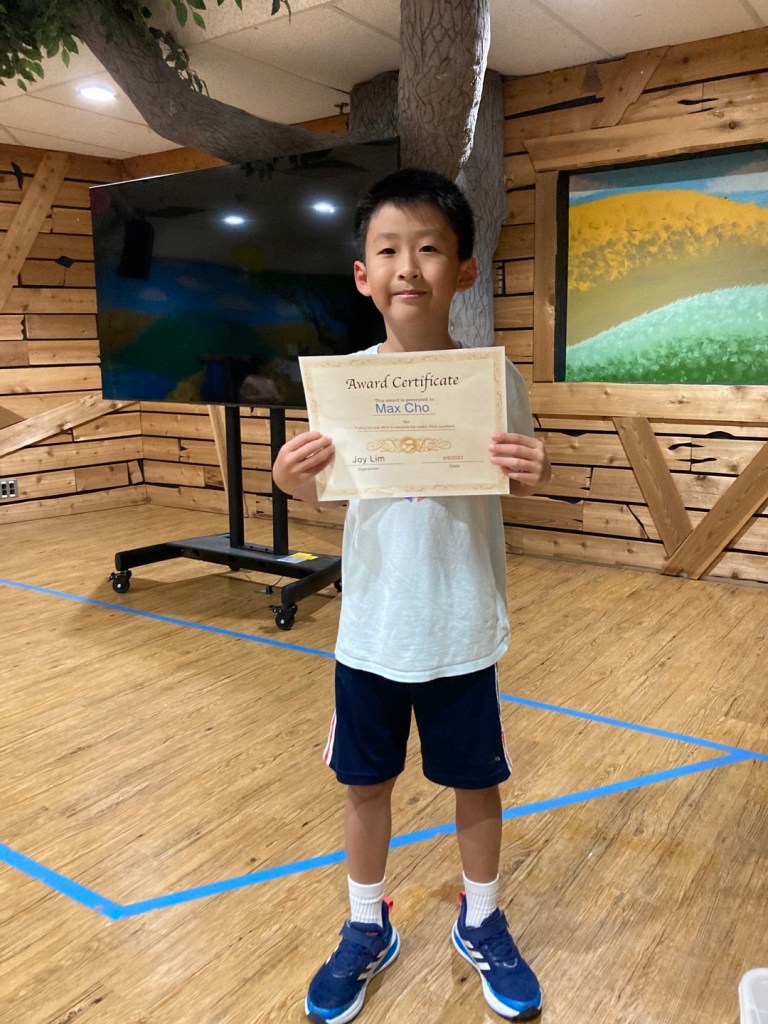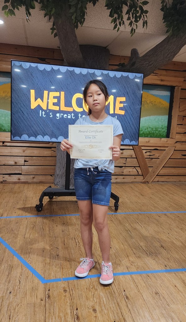 매주 성경퀴즈를 제출한 유년부 학생중에서 2명을 뽑아서 20포인트와 Award Certificate 을 드립니다. 지난주와 이번주 4명의 학생이 오늘 받았습니다. 상받은 학생은 Ellie Oh, Max Cho, Yejin Bae, Caleb Jo 입니다. 모두 축하합니다.
