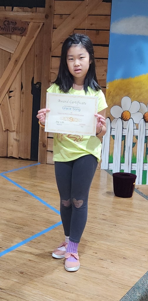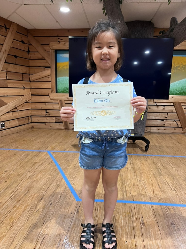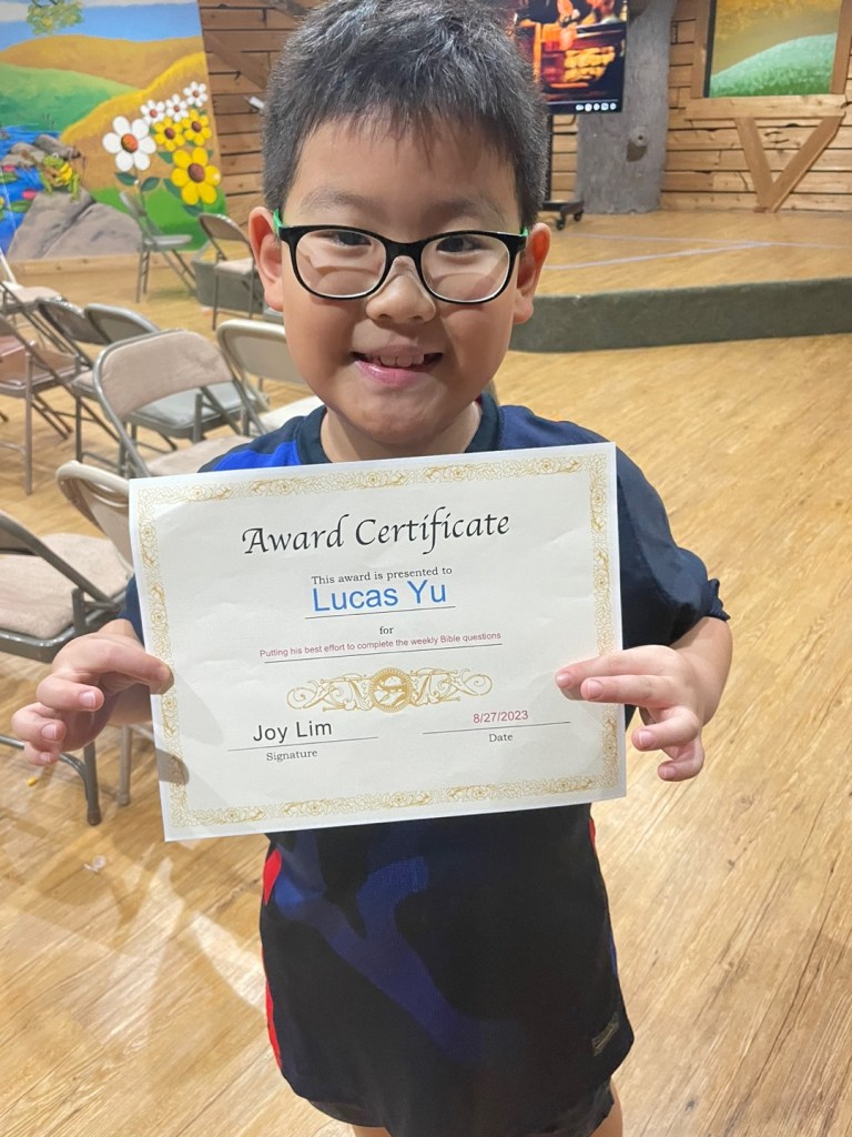 매주 성경퀴즈를 제출한 유년부 학생중에서 2명을 뽑아서 20포인트와 Award Certificate 을 드립니다. 지난주와 이번주 4명의 학생이 오늘 받았습니다. 상받은 학생은 Lucas Yu, Grace Song, Ellen Oh, Lucia Yu 입니다. 모두 축하합니다.