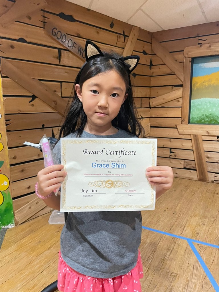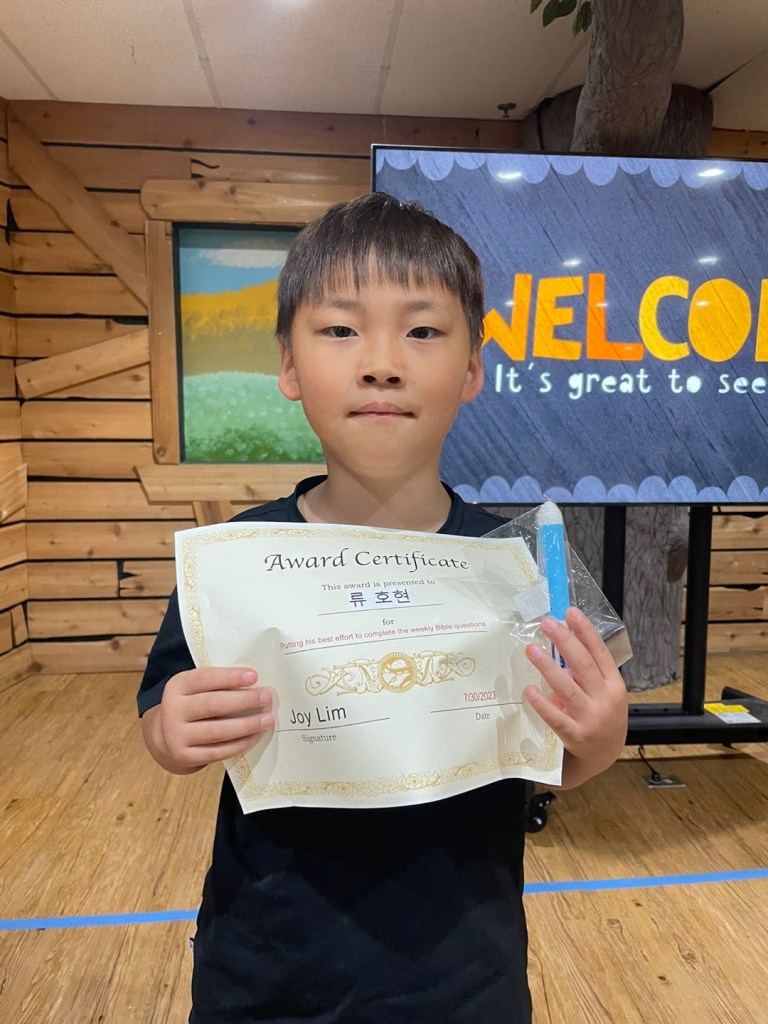 9/10/23 Award 공지사항 매주 성경퀴즈를 제출한 유년부 학생중에서 2명을 뽑아서 20포인트와 Award Certificate 을 드립니다. 오늘 2명이 상을 받았습니다. 상받은 학생은 Grace Shim 과 류 호현 입니다. 모두 축하합니다. 관련