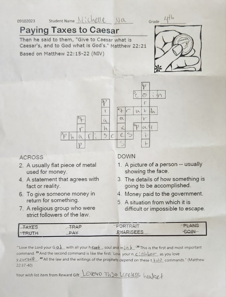 많은 학생들이 성경퀴즈를 해서 제출을 해 주었습니다. 부모님께서 적극적으로 아이들에게 격려해 주시길 부탁드립니다. 이름이 없거나 알아 볼수 없는 것은 앞으로 유년부 벽면에 걸어 놓아서 이름을 써서 다시 제출 하도록 하려 합니다.