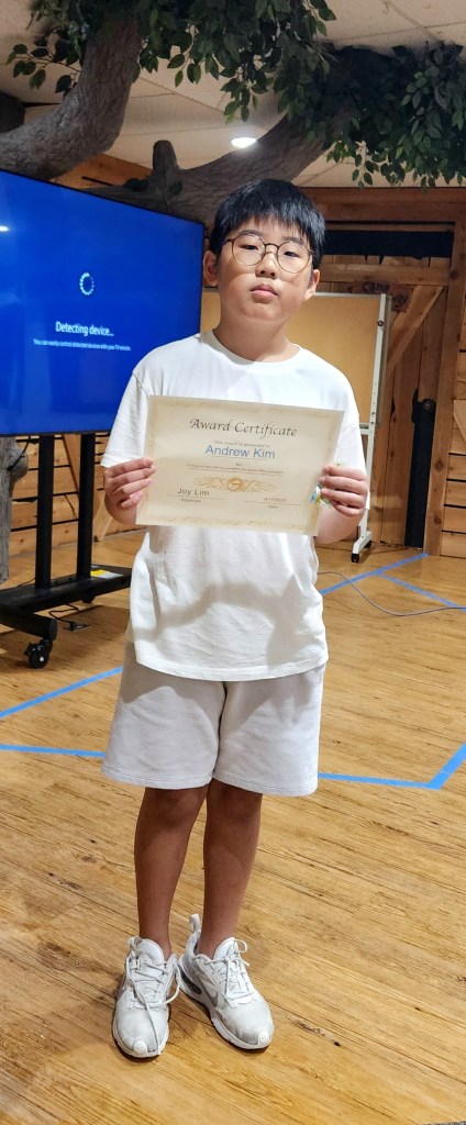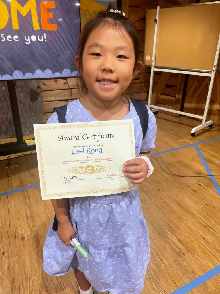 매주 성경퀴즈를 제출한 유년부 학생중에서 2명을 뽑아서 20포인트와 Award Certificate 을 드립니다. 오늘 3명이 상을 받았습니다. 상받은 학생은 Andrew Kim, Michelle Na 그리고 Lael Kong 입니다. 축하합니다.