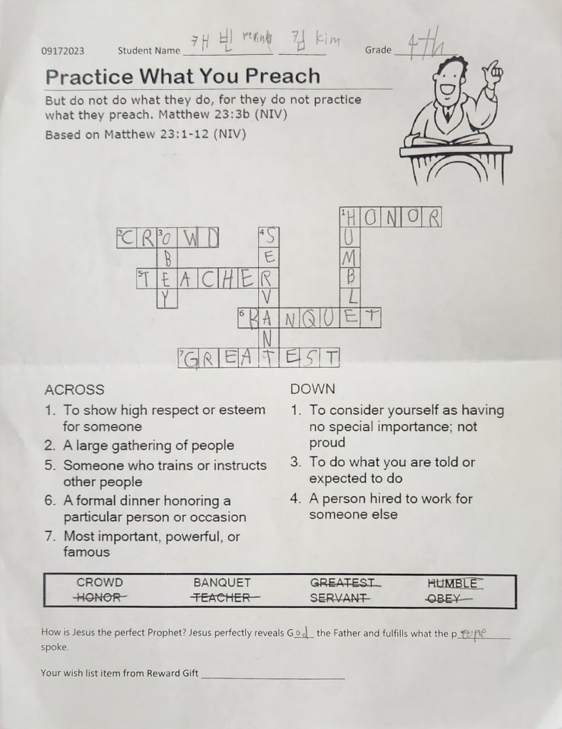 많은 학생들이 성경퀴즈를 해서 제출을 해 주었습니다. 부모님께서 적극적으로 아이들에게 격려해 주시길 부탁드립니다. 이름이 없거나 알아 볼수 없는 것은 앞으로 유년부 벽면에 걸어 놓아서 이름을 써서 다시 제출 하도록 하려 합니다.