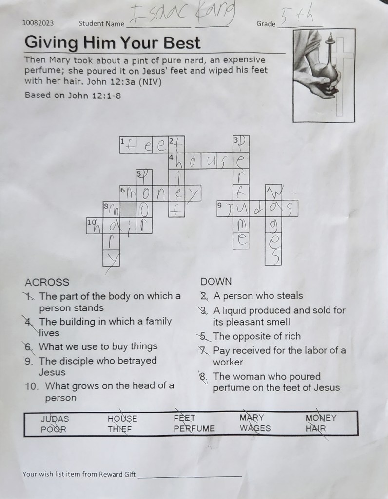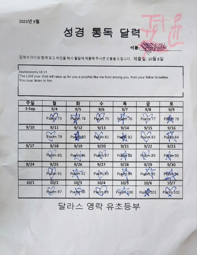 많은 학생들이 성경퀴즈를 해서 제출을 해 주었습니다. 부모님께서 적극적으로 아이들에게 격려해 주시길 부탁드립니다. 이름이 없거나 알아 볼수 없는 것은 앞으로 유년부 벽면에 걸어 놓아서 이름을 써서 다시 제출 하도록 하려 합니다.