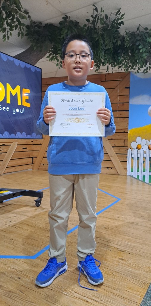 10/30/23 Award 공지사항 매주 성경퀴즈를 제출한 유년부 학생중에서 2명을 뽑아서 20포인트와 Award Certificate 을 드립니다. 오늘 1명이 상을 받았습니다. 상받은 학생은 Joon Lee 입니다. 축하합니다. 관련