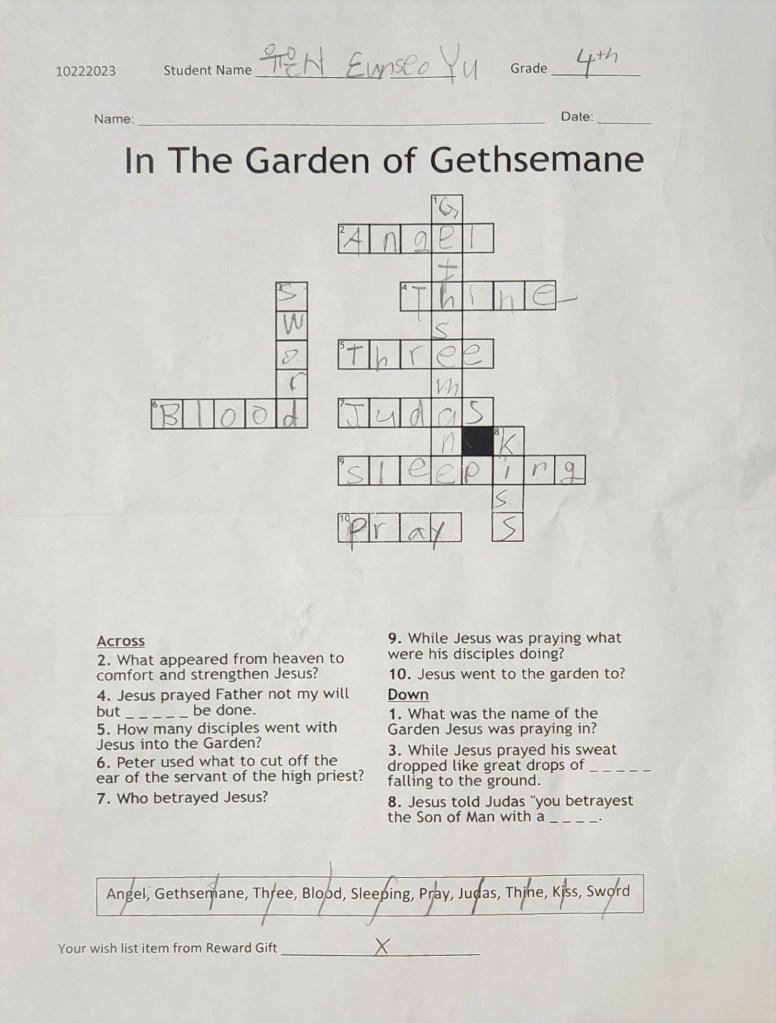 많은 학생들이 성경퀴즈를 해서 제출을 해 주었습니다. 부모님께서 적극적으로 아이들에게 격려해 주시길 부탁드립니다. 이름이 없거나 알아 볼수 없는 것은 앞으로 유년부 벽면에 걸어 놓아서 이름을 써서 다시 제출 하도록 하려 합니다.