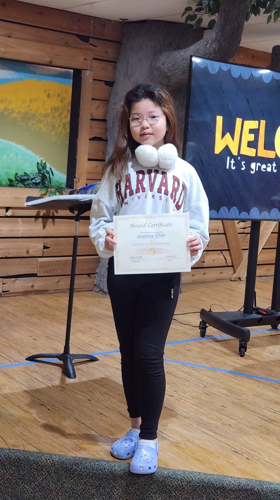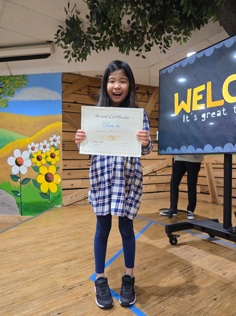 11/26/23 Award 공지사항 매주 성경퀴즈를 제출한 유년부 학생중에서 2명을 뽑아서 20포인트와 Award Certificate 을 드립니다. 오늘 2명이 상을 받았습니다. 상받은 학생은 Joannah Shin 과 Chloe Jo 입니다. 축하합니다. 관련