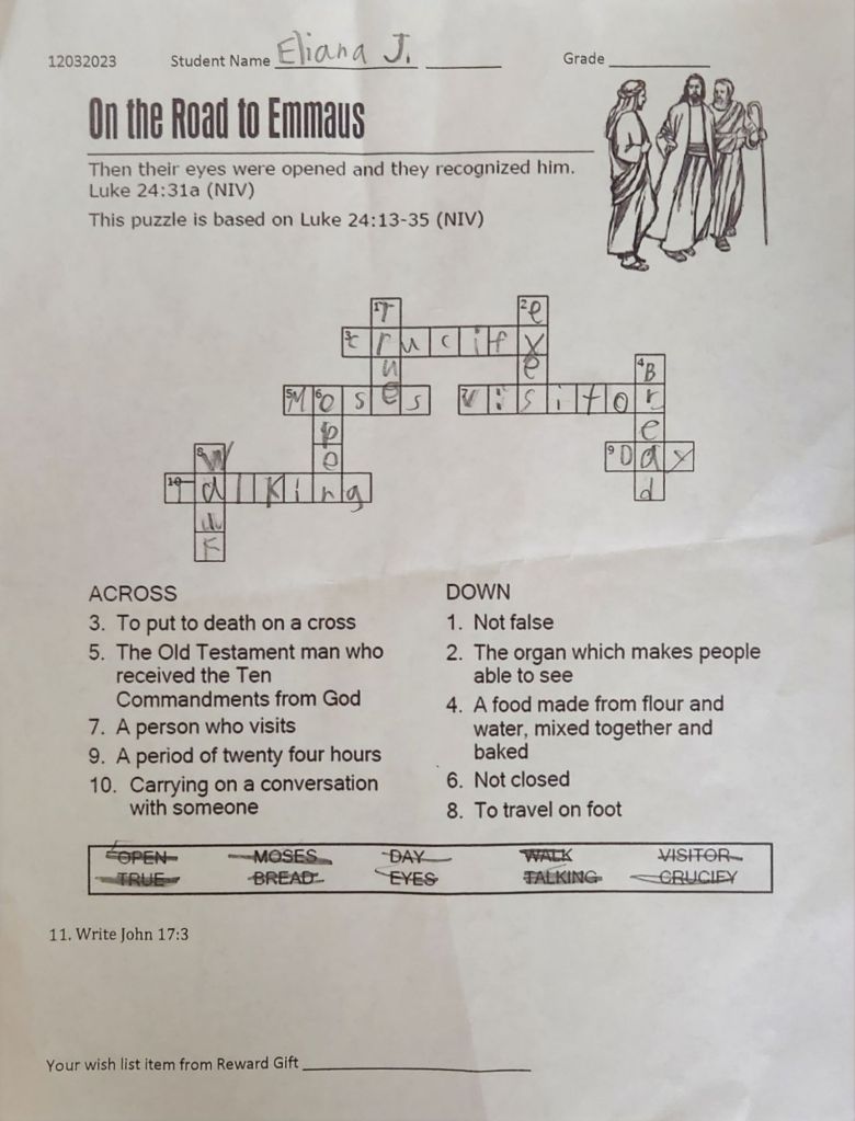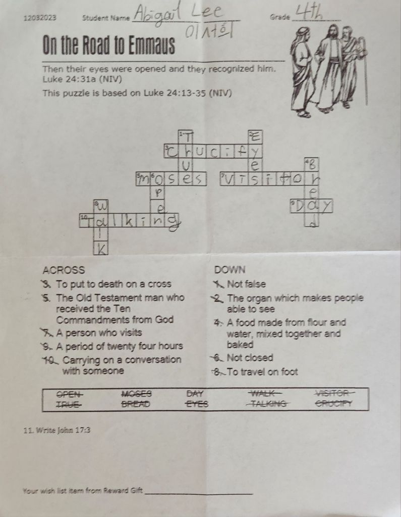 많은 학생들이 성경퀴즈를 해서 제출을 해 주었습니다. 부모님께서 적극적으로 아이들에게 격려해 주시길 부탁드립니다. 이름이 없거나 알아 볼수 없는 것은 앞으로 유년부 벽면에 걸어 놓아서 이름을 써서 다시 제출 하도록 하려 합니다.