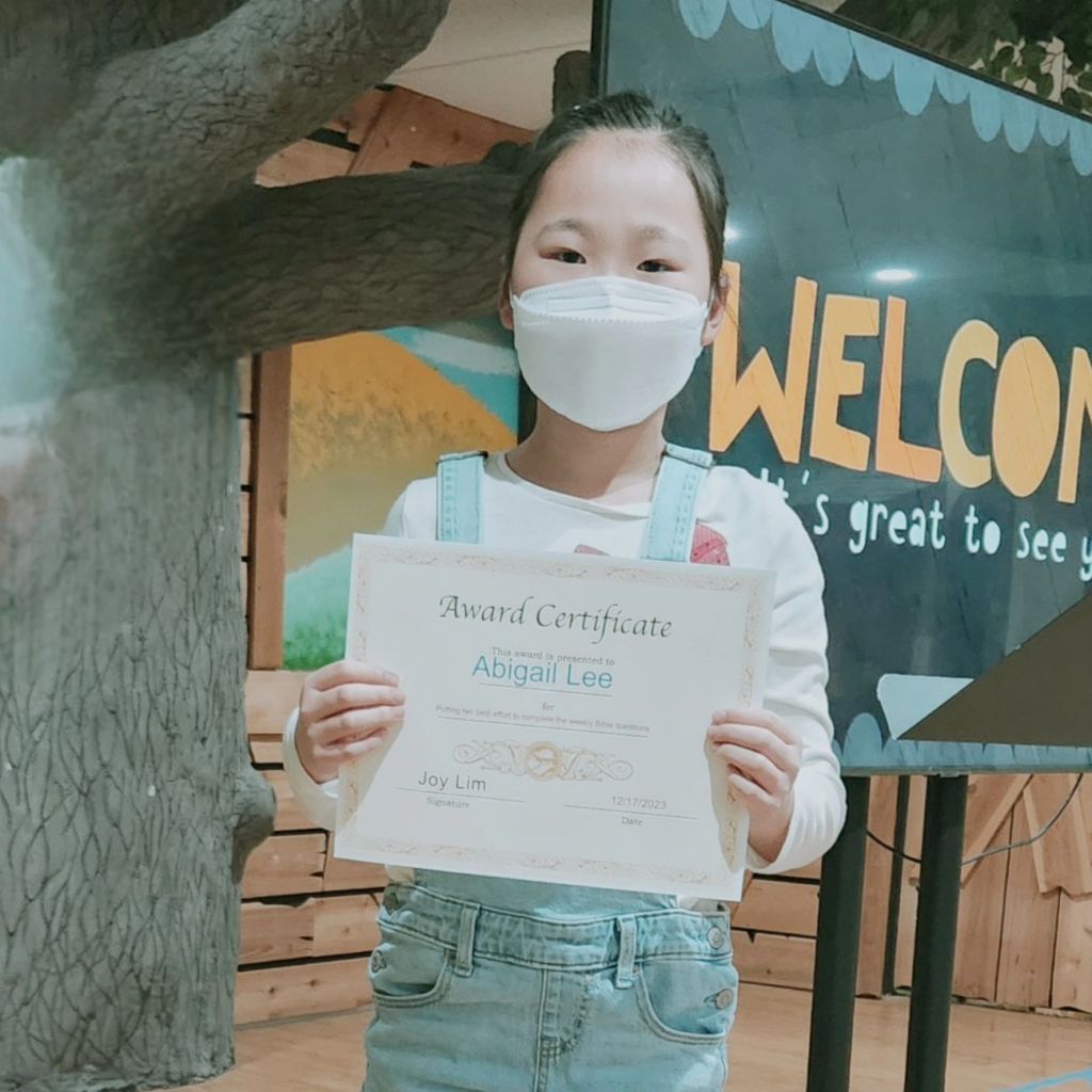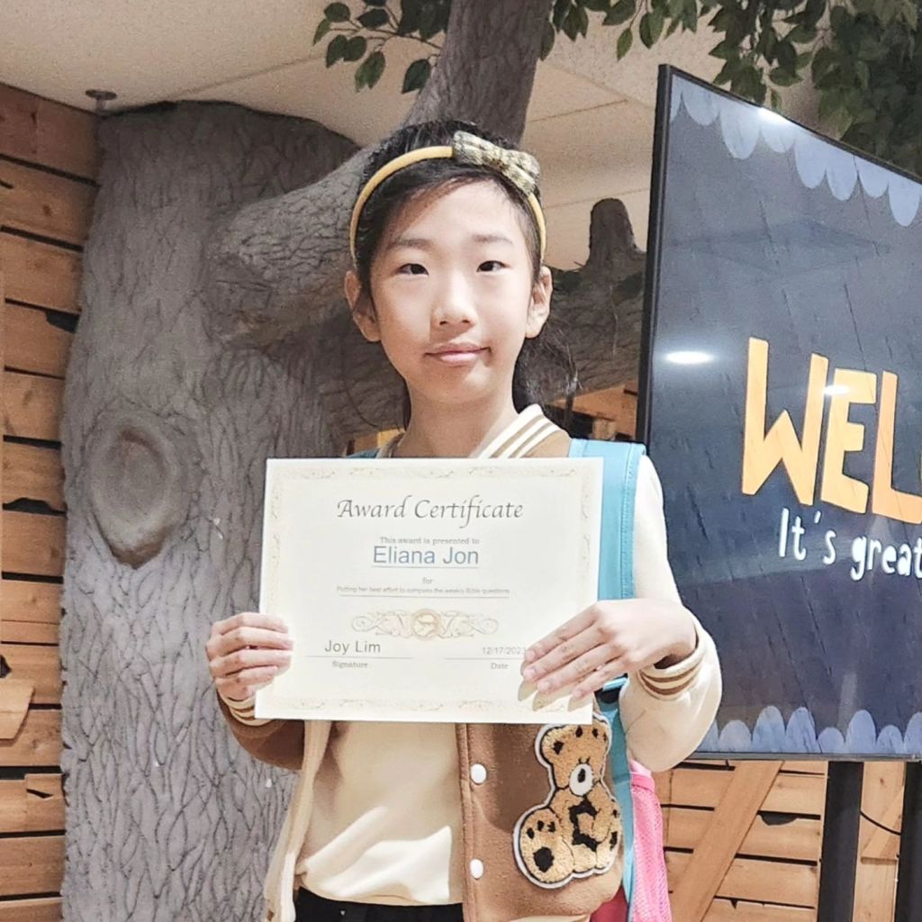 매주 성경퀴즈를 제출한 유년부 학생중에서 2명을 뽑아서 20포인트와 Award Certificate 을 드립니다. 오늘 2명이 상을 받았습니다. 상받은 학생은 Abigail Lee 와 Eliana Jon 입니다. 축하합니다.