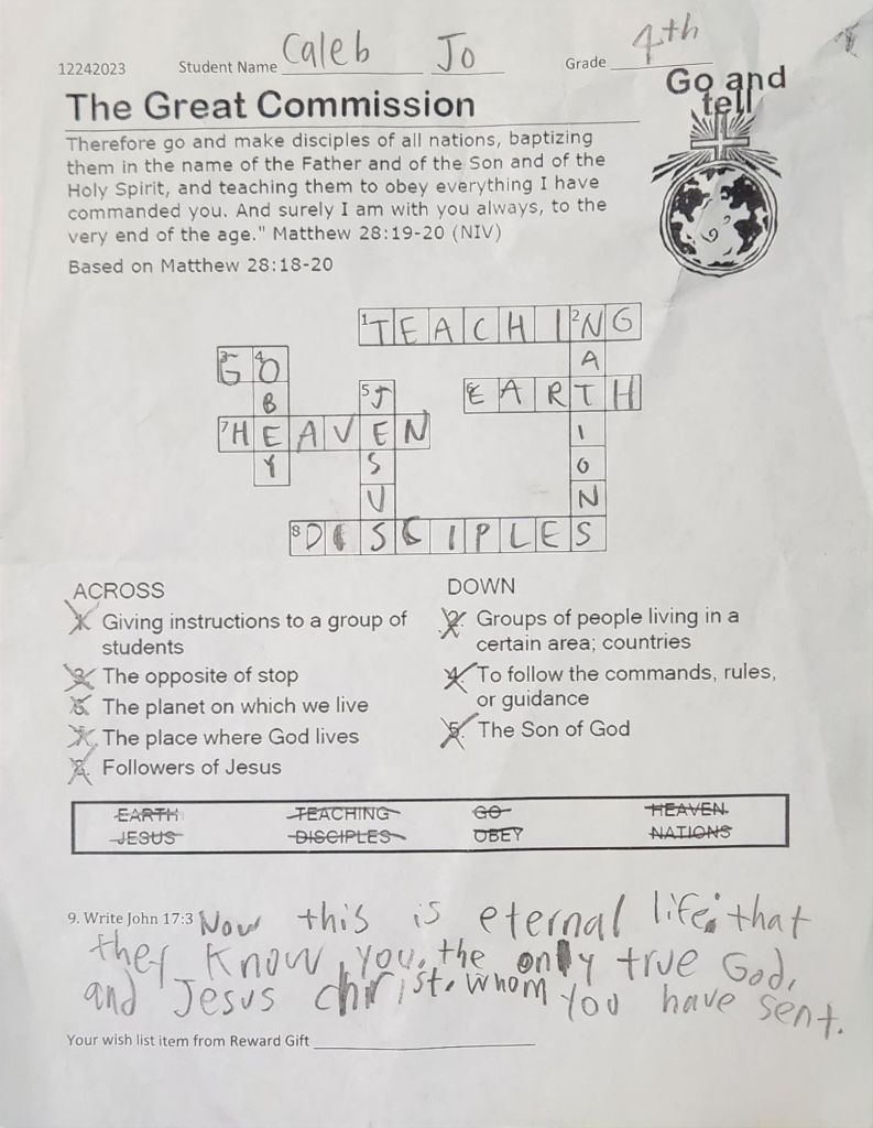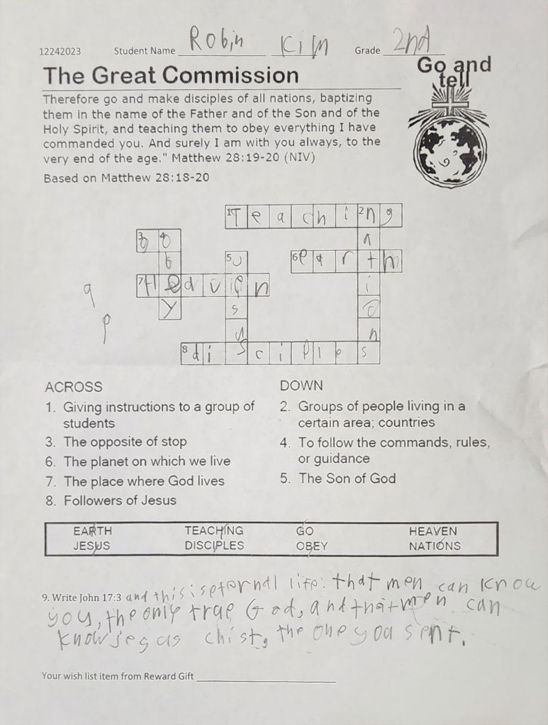 많은 학생들이 성경퀴즈를 해서 제출을 해 주었습니다. 부모님께서 적극적으로 아이들에게 격려해 주시길 부탁드립니다. 이름이 없거나 알아 볼수 없는 것은 앞으로 유년부 벽면에 걸어 놓아서 이름을 써서 다시 제출 하도록 하려 합니다.