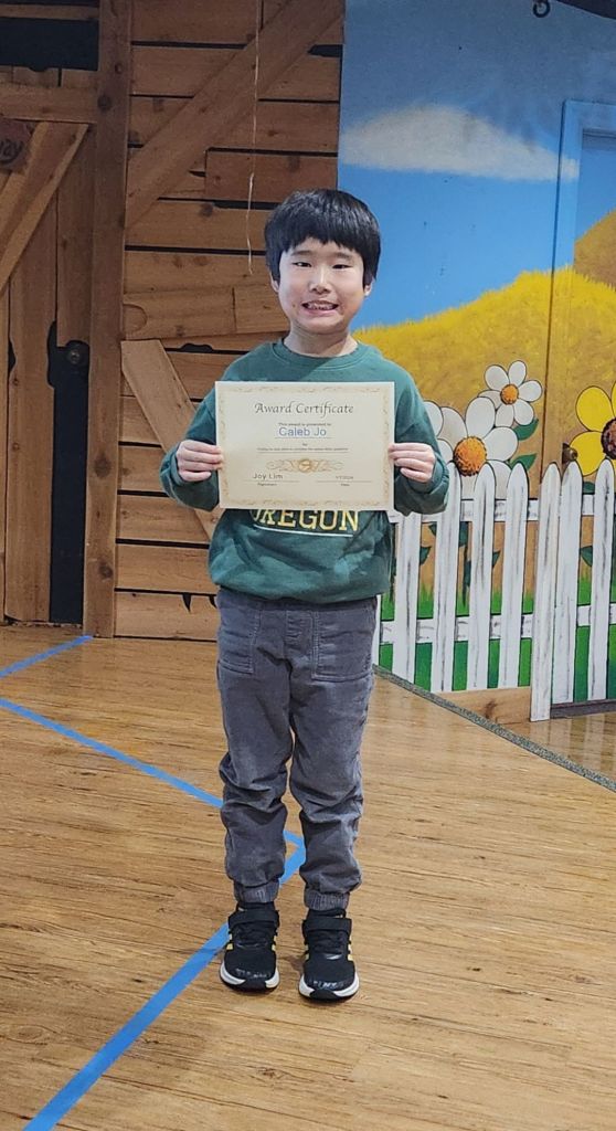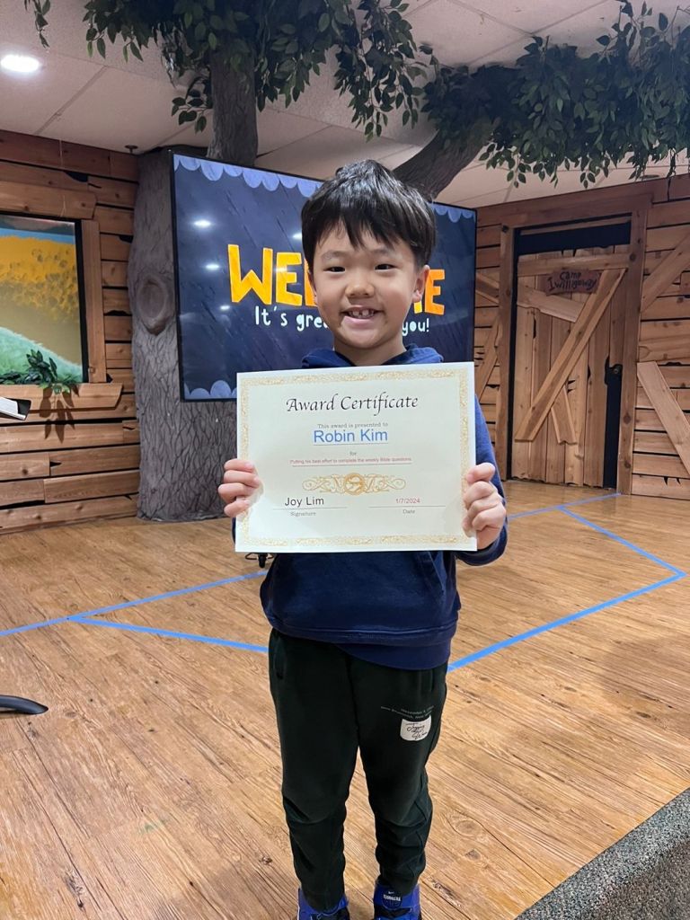 1/8/24 Award 공지사항 매주 성경퀴즈를 제출한 유년부 학생중에서 2명을 뽑아서 20포인트와 Award Certificate 을 드립니다. 오늘 2명이 상을 받았습니다. 상받은 학생은 Celeb Jo 와 Robin Kim 입니다. 축하합니다. 관련