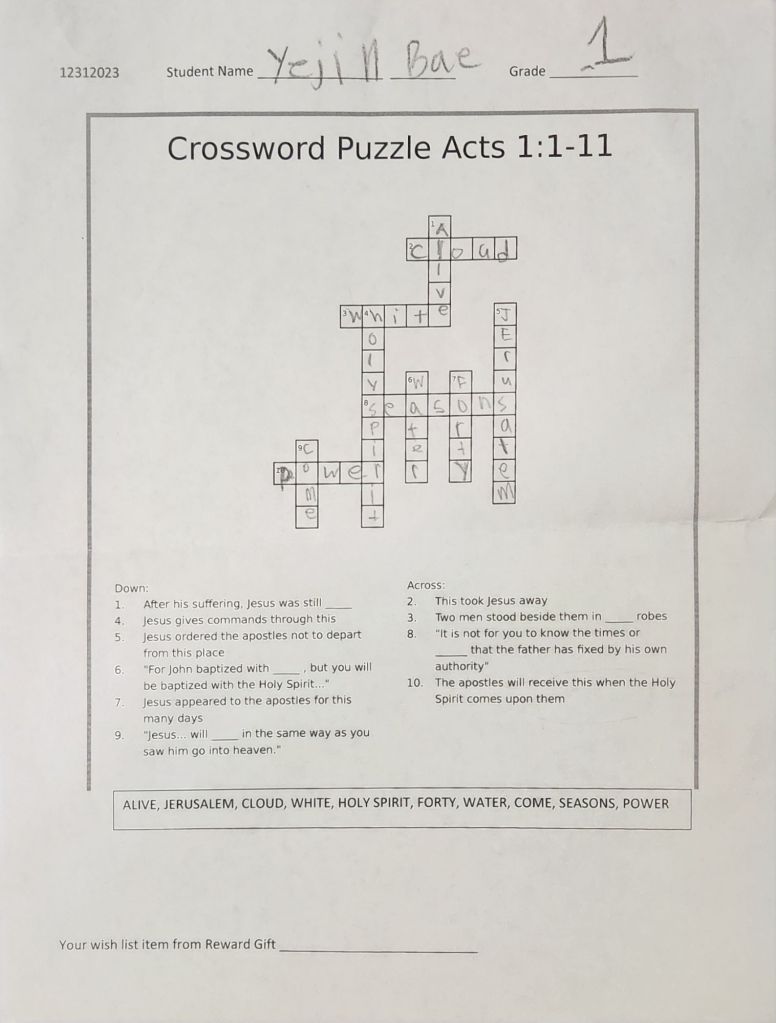 2명이 20 포인트를 받게 되었습니다. Yejin Bae 과 Elena Kim 받게 되었습니다. 그리고는 선물을 미리 준비하기 위해서 미리 원하는 선물을 매주 성경퀴즈에 적어도 보내 주시거나 담임선생님께 얘기를 해 주시면 wishlist 에 기록해서 될수 있으면 미리 준비하도록 하겠습니다.