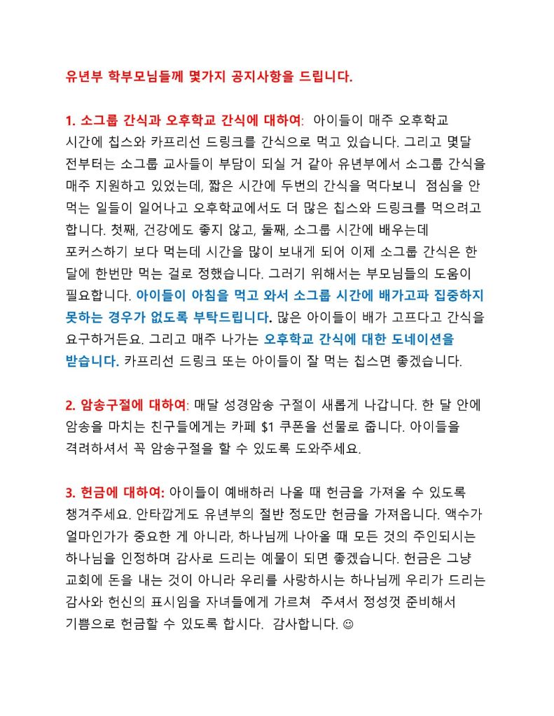 2/3/24 공지사항 저학년은 위의 구절이 길고 어려워서 로마서 10:13절만 외우도록 하겠습니다.“Everyone who calls onthe name of the Lordwill be saved” 관련