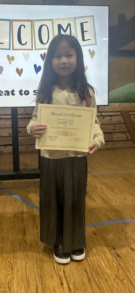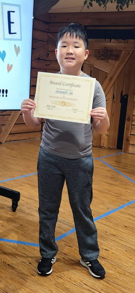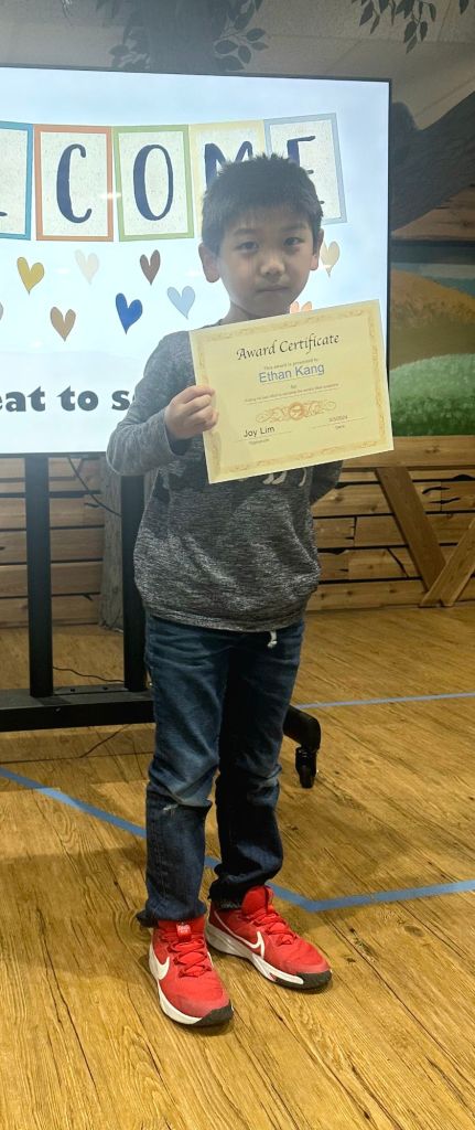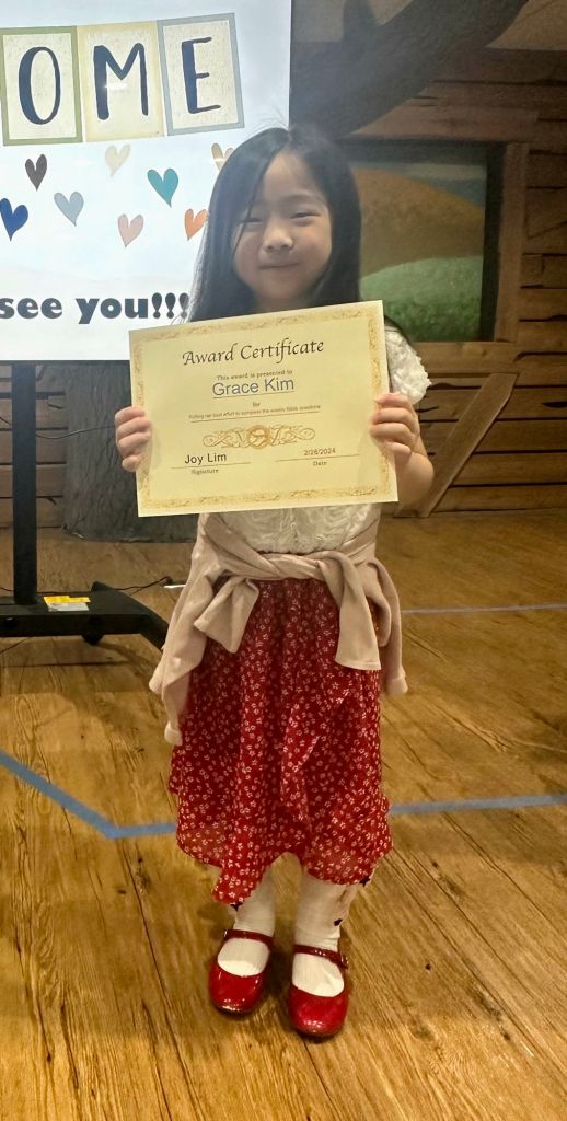 매주 성경퀴즈를 제출한 유년부 학생중에서 2명을 뽑아서 20포인트와 Award Certificate 을 드립니다. 오늘 4명이 상을 받았습니다. 상받은 학생은 Joseph Je, Ethan Kang, Lucia Yu 그리고 Grace Kim 입니다. 축하합니다.