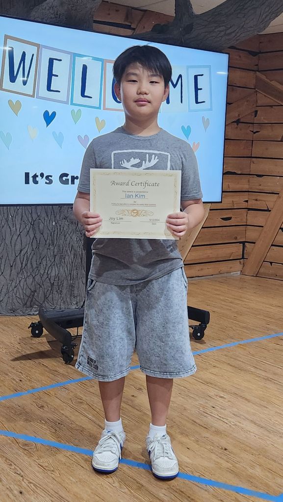 5/12/24 Award 공지사항 매주 성경퀴즈를 제출한 유년부 학생중에서 2명을 뽑아서 20포인트와 Award Certificate 을 드립니다. 오늘 1명이 상을 받았습니다. 상받은 학생은 Ian Kim 입니다. 축하합니다. 관련