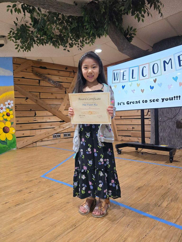 6/2/24 Award 공지사항 매주 성경퀴즈를 제출한 유년부 학생중에서 2명을 뽑아서 20포인트와 Award Certificate 을 드립니다. 오늘 1명이 상을 받았습니다. 상받은 학생은 Ha-Yoon Ku 입니다. 축하합니다. 관련