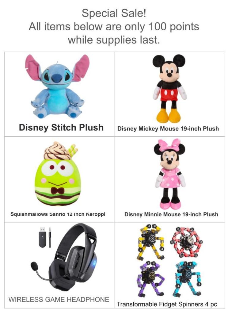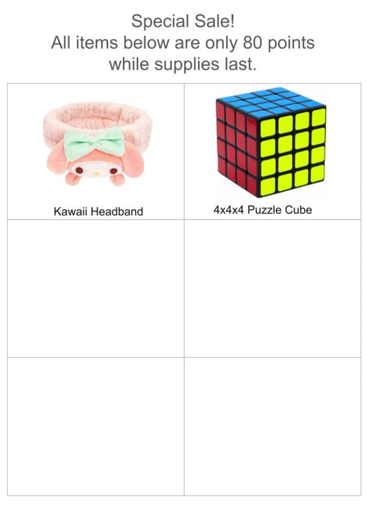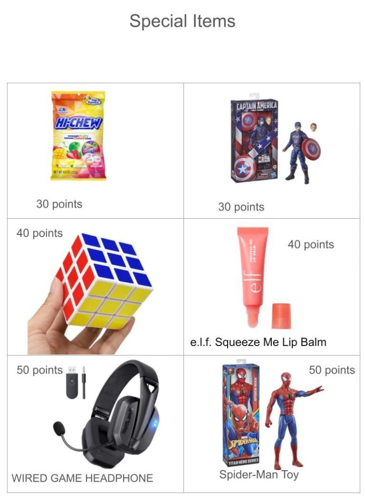 Weekly Bible Questions Reward List Updated 7/12/25 여기에 있는 선물이외에 원하는 선물이 있으면 신청해도 됩니다. 정확히 원하는 선물이 무언지 소그룹 선생님께 얘기하면 포인트가 얼마나 필요한지 알려 드립니다.